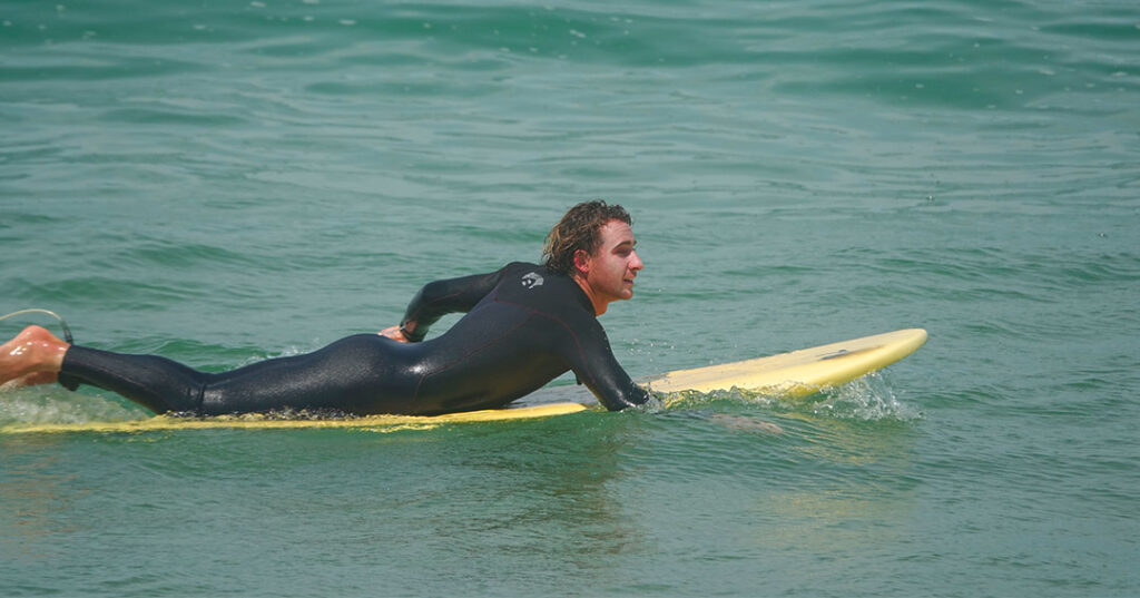 It’s not about becoming a stiff stick on a board, or a sack of potatoes slumped over on the board’s deck. Plank position is the sensation of strength emanating from the center. To visualize a starting point, you can try to bring your navel closer to your spine, thinking about tightening your abdominal girdle and perineum. You can imagine a rectangular block between the pelvis and the sternum. The plank position will prevent you from clinging to the board during the “start” in the instability of the foam, so you can keep your arms free to balance yourself and paddle, which is one of the most important actions in surfing.