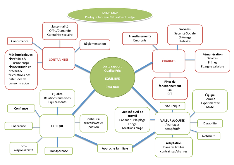 Pour schématiser, on a donc une partie contraintes et charges (en rouge sur la mind map) relativement chiffrable et une partie plus « vaporeuse » et plus difficile à mettre en chiffre, tout autant importante mais souvent négligée (en vert) : l’éthique et la valeur ajoutée.