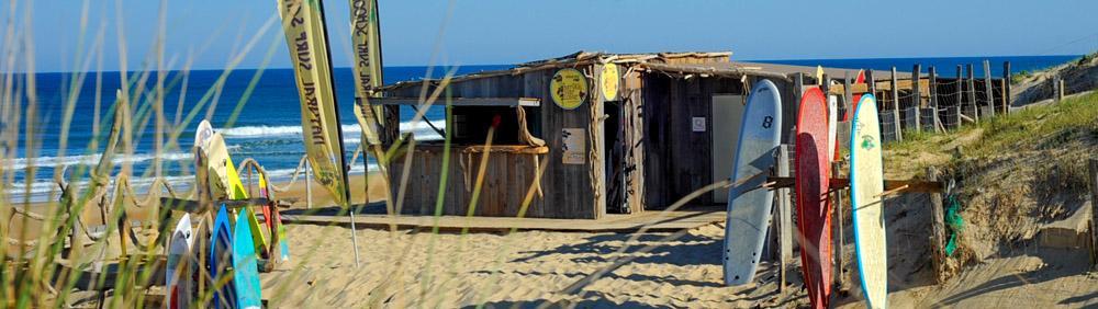 Notre cabane école de surf est située sur la plage des Casernes à Seignosse, dans les Landes, non loin de Biarritz.