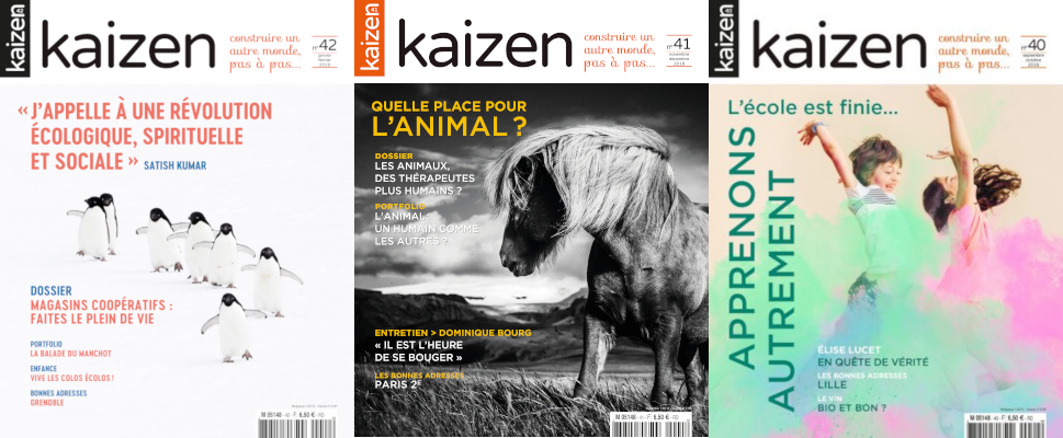 Le magazine Kaizen tient son nom de la fusion des deux mots japonais kai et zen qui signifient « changement » et « meilleur ». Si la traduction française courante est « amélioration continue », par extension, kaizen signifie « analyser pour rendre meilleur ». Et c’est bien la mission de ce magazine papier. Nous sommes abonnés à ce bimestriel qui donne la parole à ceux qui œuvrent pour un monde intelligent, sobre avec pour priorité l’épanouissement de la vie sur notre planète. Tous les 2 mois, de belles rencontres, des initiatives riches et pionnières qui démontrent qu’un changement sociétal est nécessaire mais surtout possible ! Le sous-titre du magazine est » Construire un autre monde, pas à pas. » Un angle positif sur les thématiques de l’éducation, de la santé, de l’environnement. Lancé en 2012 par Cyril Dion, co-fondateur avec Pierre Rabhi et directeur du Mouvement Colibris, Pascal Greboval, journaliste et photographe indépendant, Yvan Saint-Jours, fondateur et rédacteur en chef du magazine La Maison Écologique, Kaizen a été co-financé par des campagnes de financement participatif. Et donc par les lecteurs ! Par son ton et ses choix éditoriaux, ce magazine représente une bouffée d’air frais et d’inspiration !